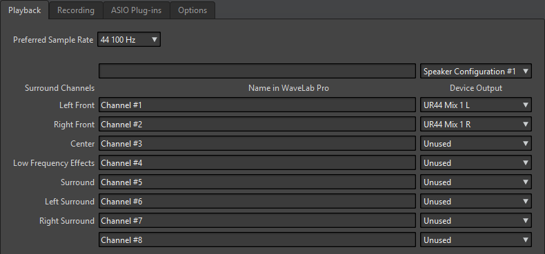 Außerdem können Sie die Bevorzugte Samplerate für die Wiedergabe festlegen. Außerdem können Sie die Kanäle umbenennen und die Lautsprecher-Konfiguration einrichten, um zwischen verschiedenen Lautsprechern umschalten zu können.