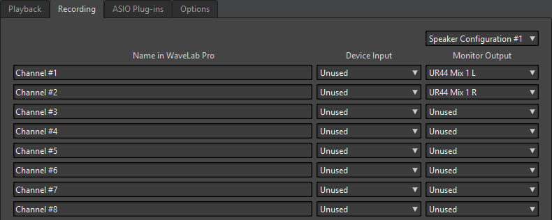Auf dieser Registerkarte können Sie die Audioanschlüsse auswählen und benennen, die für die Aufnahme und das Eingangs-Monitoring verwendet werden. Die Eingänge, die Sie hier definieren, sind anschließend im Aufnahme-Dialog verfügbar. Außerdem können Sie die Kanäle umbenennen und die Lautsprecher-Konfiguration auswählen.